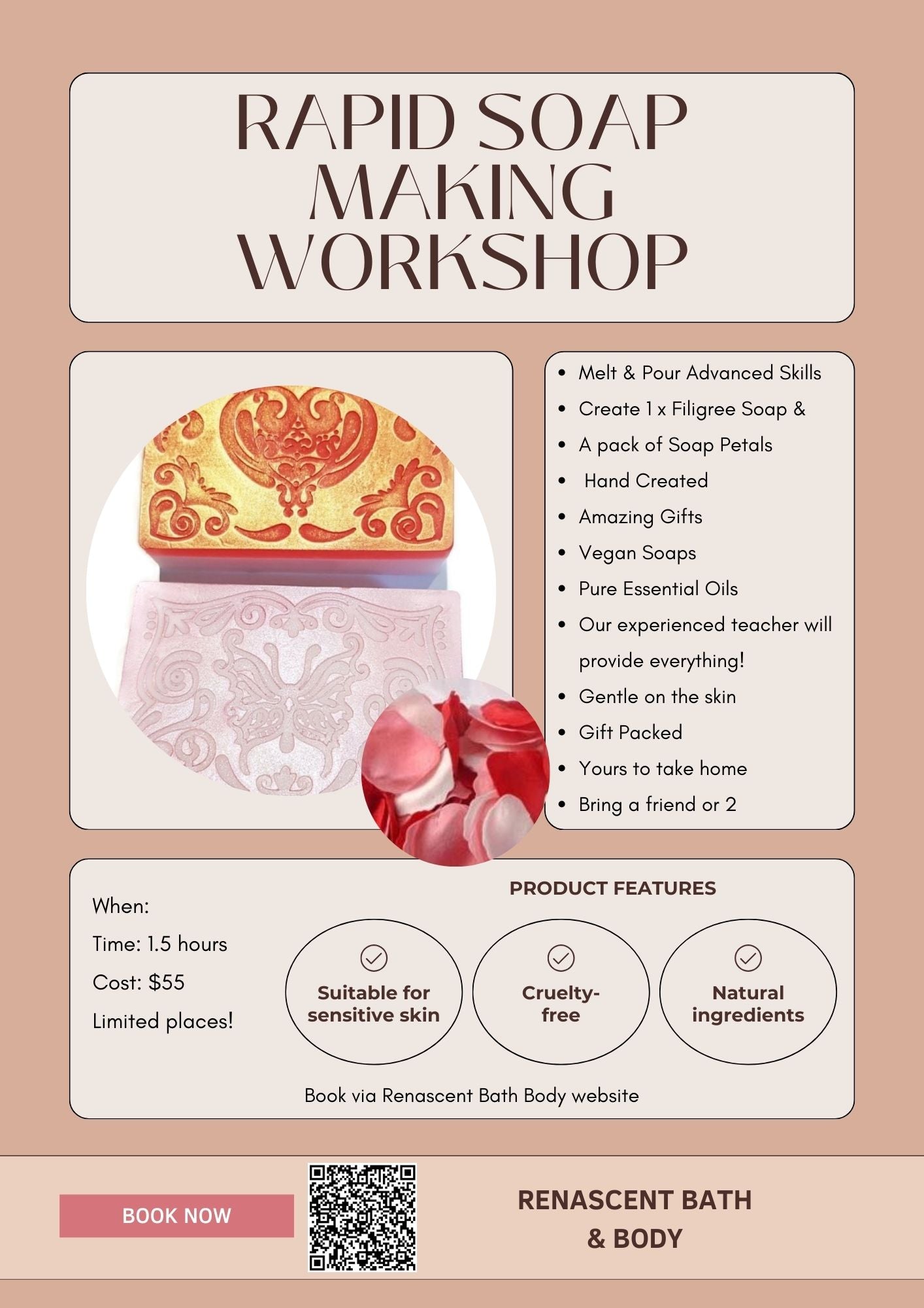 Our experienced teacher will provide all the equipment and ingredients you need, all vegan ingredients that are kind to your skin.